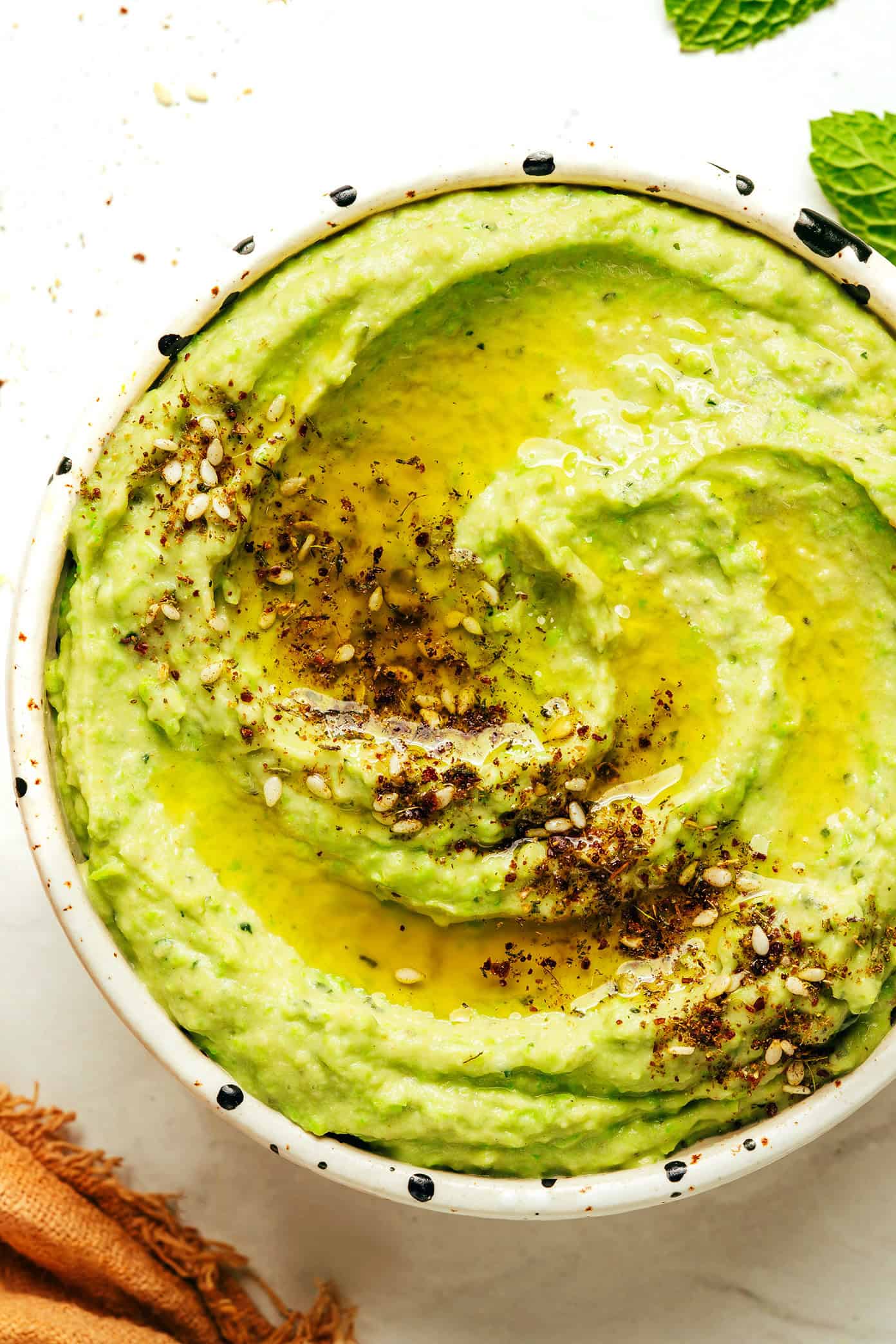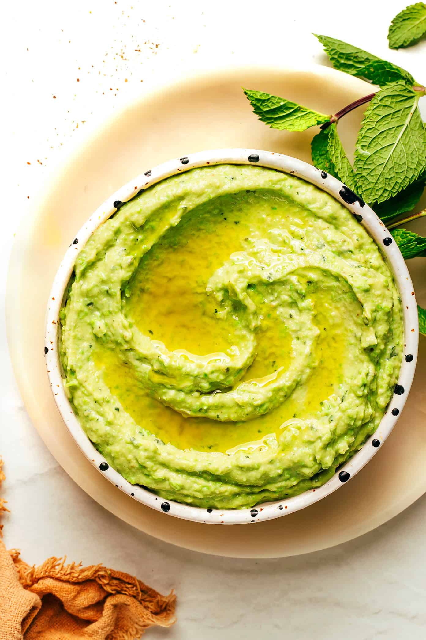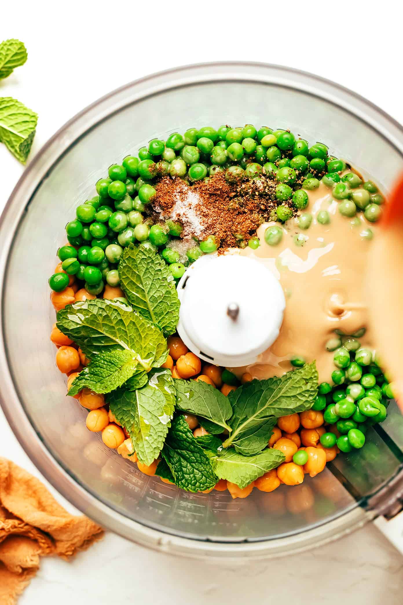 This mint pea hummus recipe is easy to make in 10 minutes and perfectly balanced with sweet and savory flavors.