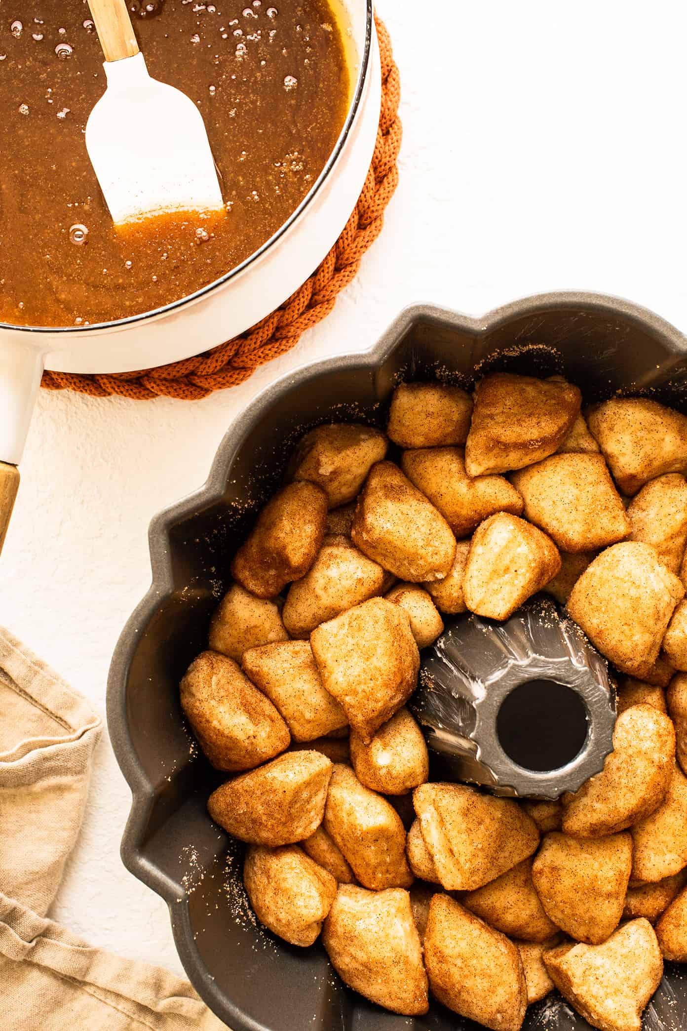- Use a bundt pan. There’s a reason that monkey bread is traditionally made in bundt or tube pans. The design of the pan allows the biscuits to cook evenly (avoiding an undercooked center) and ensures extra gooey, caramelized eges.