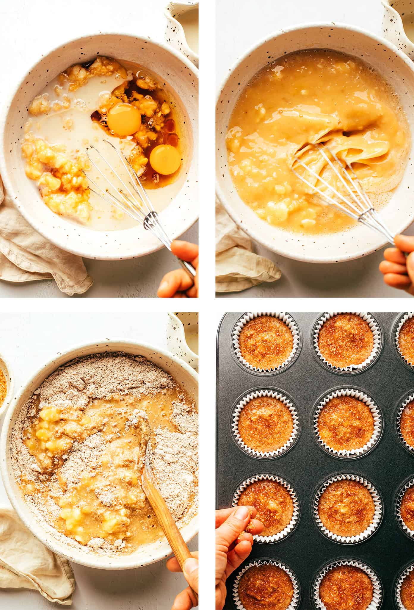 - Whisk together your wet ingredients: In a separate mixing bowl, whisk together the mashed bananas, eggs, maple syrup, almond milk and vanilla until evenly combined.