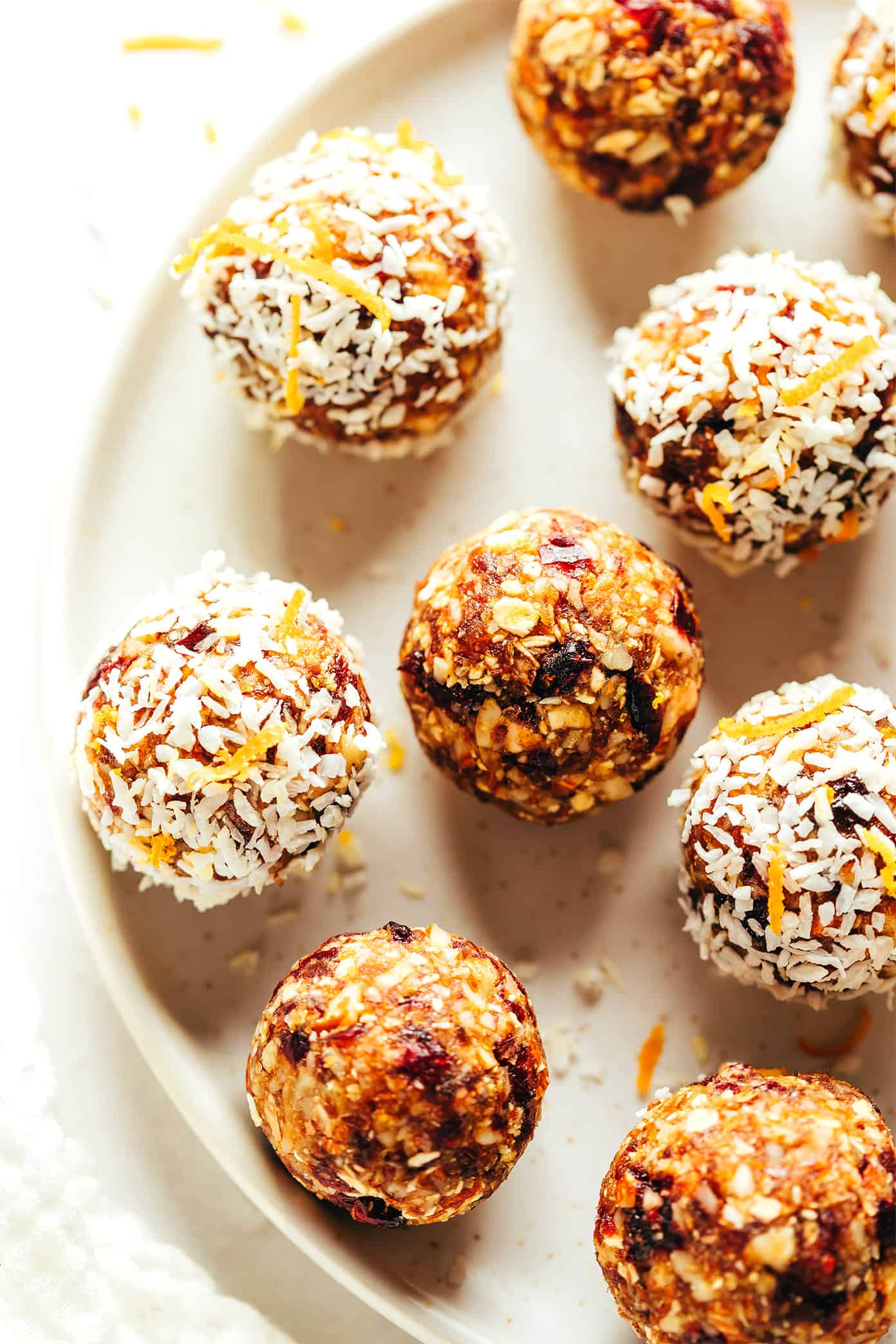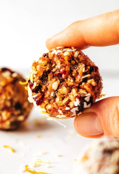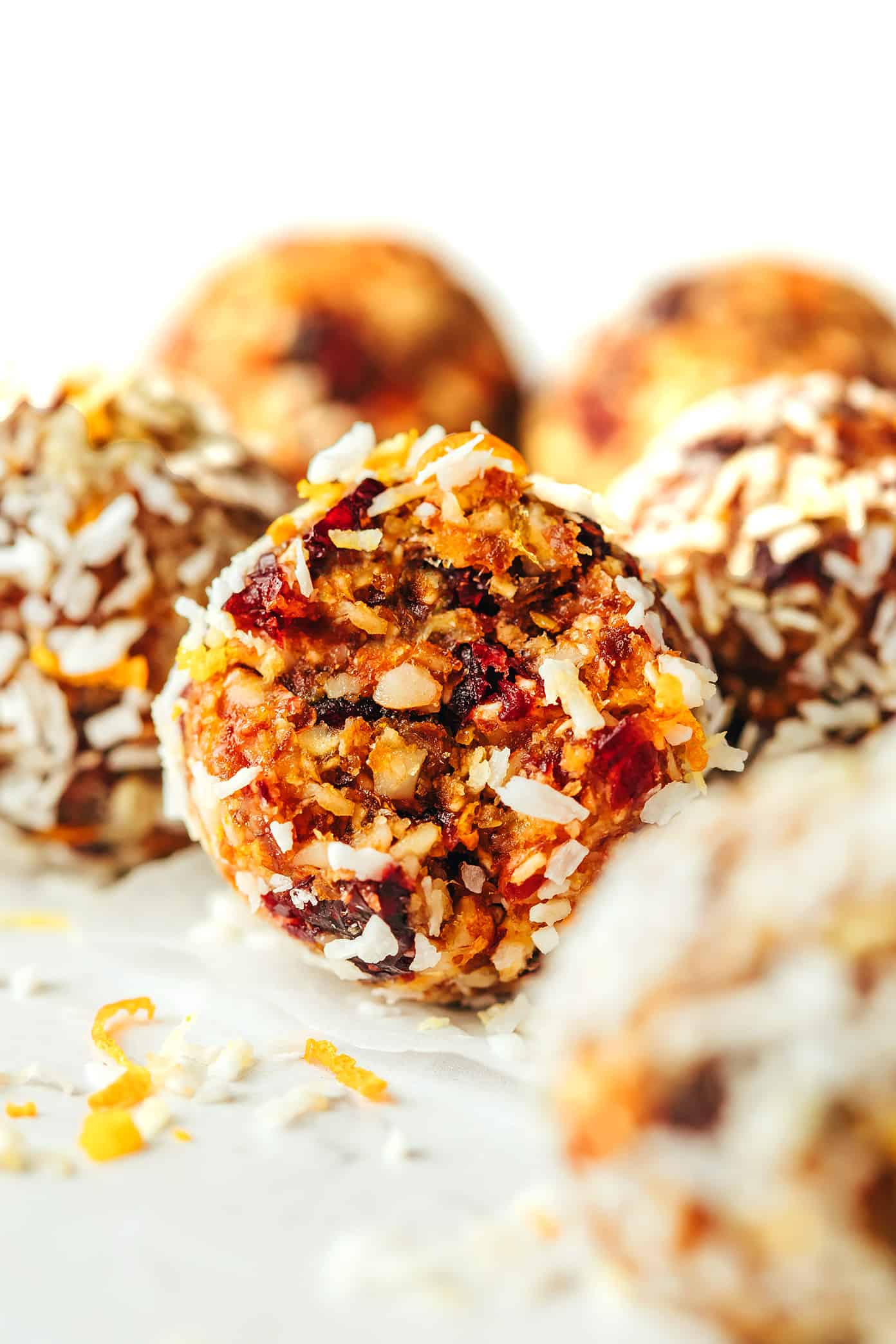 They’re loaded up with some of my favorite feel-good energy bite ingredients, including almonds, oats, flax, shredded coconut, dates, dried cranberries, and fresh orange juice/zest. And they’re quick and easy to make in the food processor by just blitzing all of the ingredients together. Feel free to roll them in a bit of extra coconut or just serve them plain — both options are delicious!