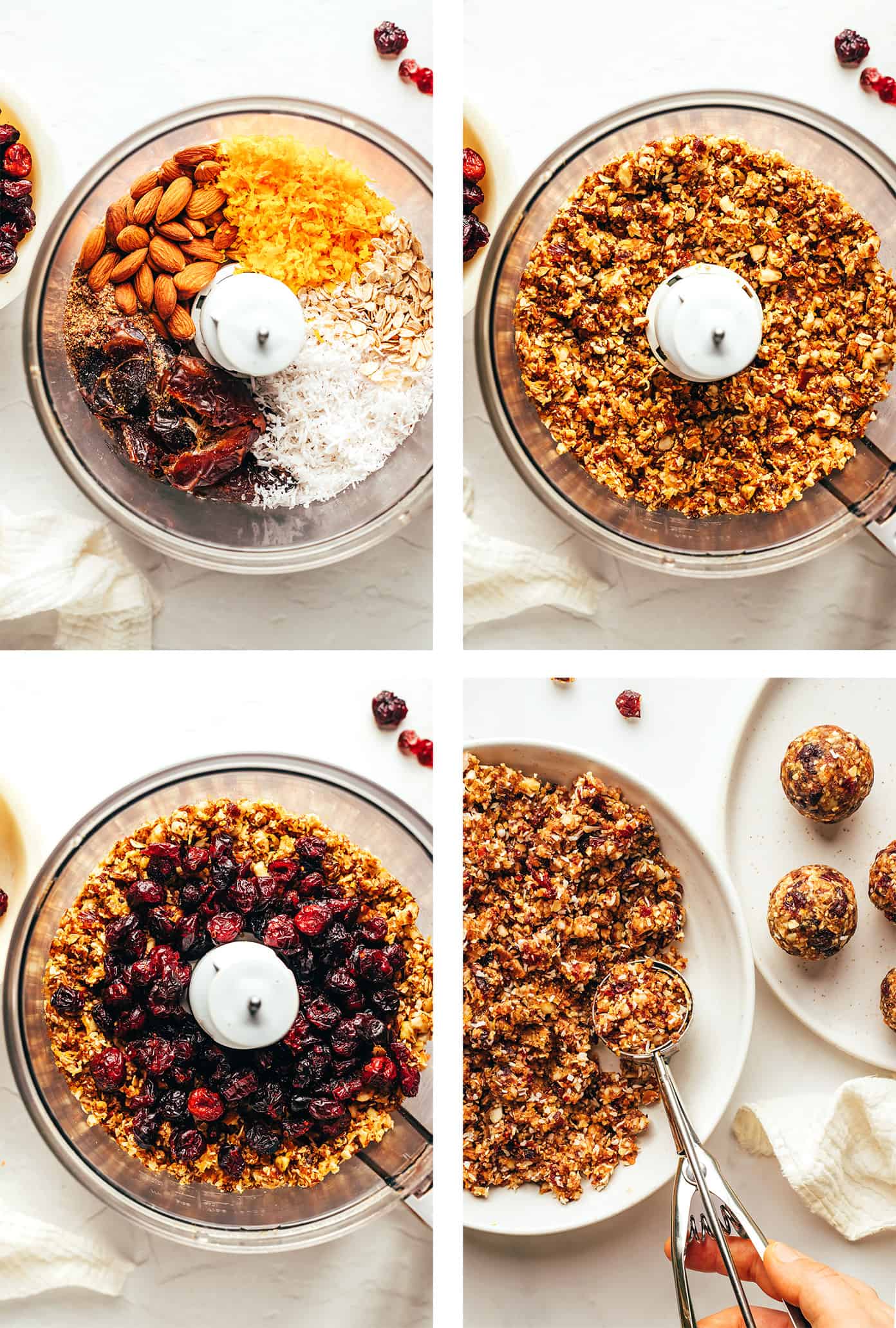 - Blend. Combine all of the energy bite ingredients in a food processor and pulse, pausing to scrape down the sides anytime needed, until the texture resembles coarse crumbs.