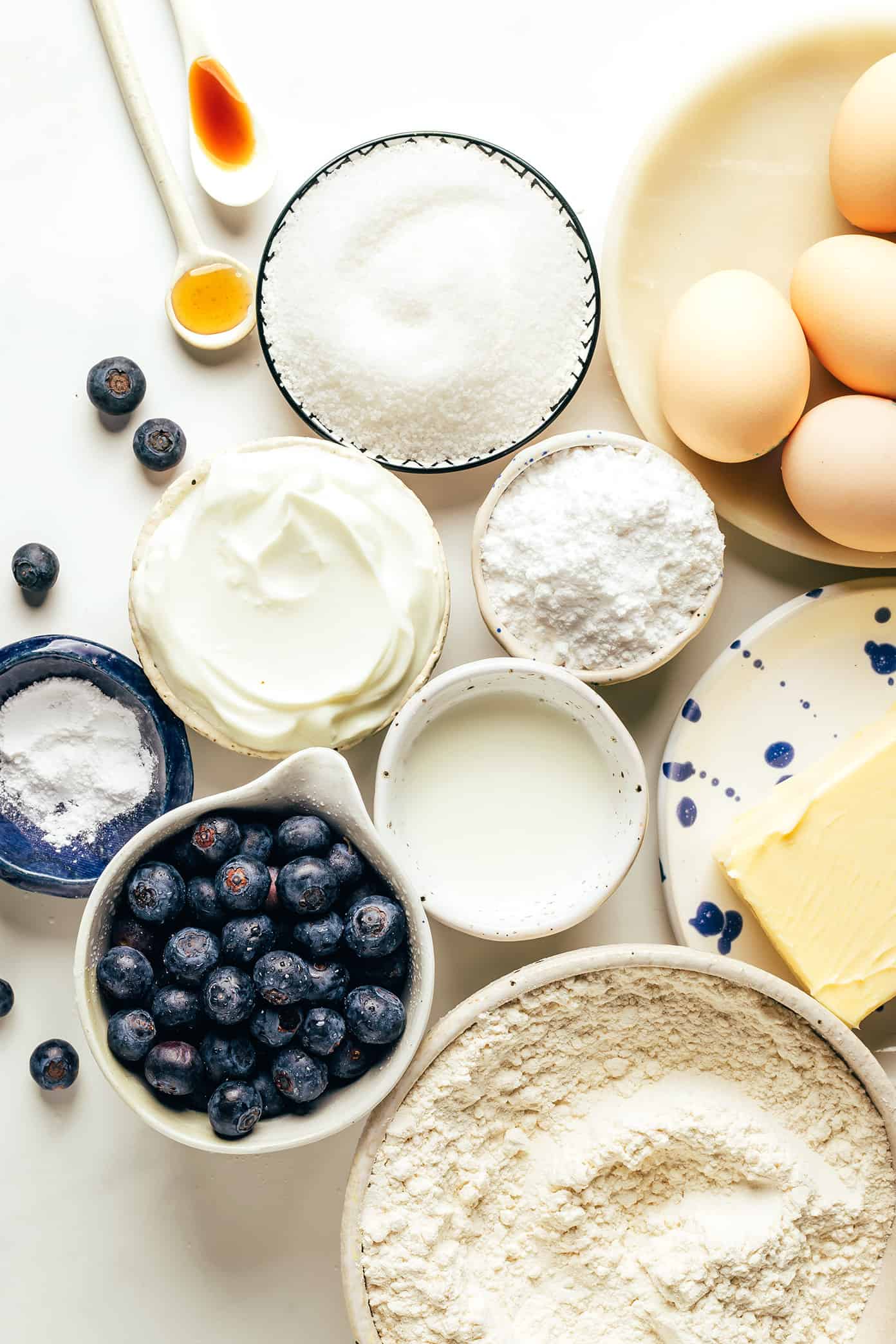 - Wet ingredients:ย You will need unsalted butter, eggs, Greek yogurt, vanilla extract and almond extract. (If you don’t have almond extract in your pantry, you’re welcome to leave it out, but I love how its flavor pairs with blueberries.)