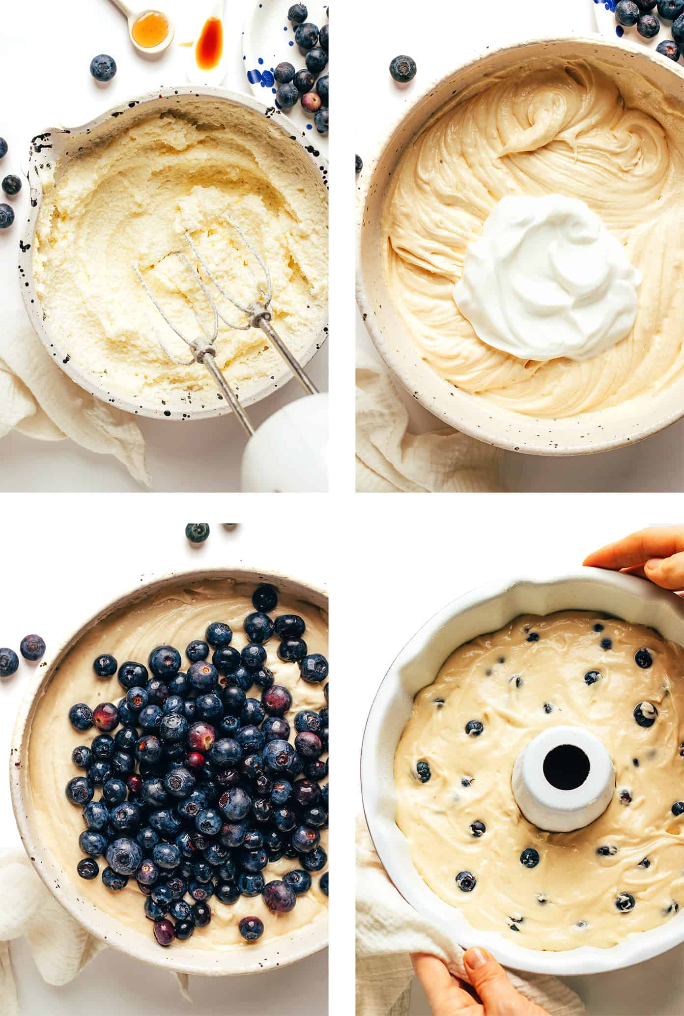 - Mix the batter. Using an electric mixer with the paddle attachment, cream butter and sugar together on medium-high speed for about 3 minutes, or until light and fluffy. Reduce speed to medium-low. Add vanilla, almond extract, and eggs (one at a time). Continue beating for an extra 2 minutes, scraping down the pan once or twice so that everything is well mixed. Add in half of the flour mixture, and beat on low speed until just combined. Add in half of the Greek yogurt, and beat on low speed until just combined. Repeat with the remaining flour mixture and Greek yogurt, beating until just combined. (Do not overbeat.) Fold in the blueberries by hand, reserving a dozen or so extra berries on the side.