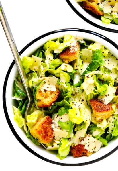 It’s made with my favorite Caesar salad dressing recipe that I shared with you all earlier this week, which is packed with a bold blend of the creamy, savory, umami flavors we all know and love in Caesar dressing (including anchovies which, yes, I consider a must). Then I’m also going to insist that we grab a loaf of crusty bread (we’re partial to sourdough in our house) and invest an extra 10 minutes of prep time to make a batch of homemade croutons, which I promise will taste a million times better than store-bought croutons and instantly elevate your Caesar game. Chop up a big bowl of crisp Romaine and give everything a good toss. (Or serve the leaves whole, as Chef Caesar reportedly did back in the day.) Add a generous sprinkle of shaved Parmesan and cracked black pepper on top. Then enjoy, enjoy, enjoy.