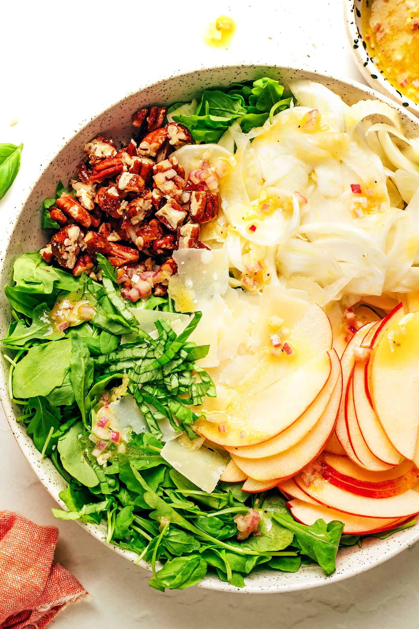 This refreshing shaved apple, fennel and arugula salad is tossed with candied pecans, Parmesan, basil and a lemon shallot vinaigrette.