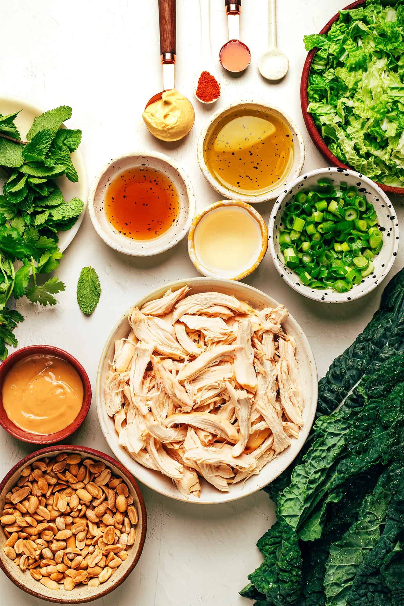 It’s made with a simple list of feel-good ingredients that come together quickly — shredded rotisserie chicken, thinly-sliced fresh kale, crunchy cabbage, lots of fresh mint and cilantro, crisp scallions, and dry-roasted peanuts. Then everything is tossed with a creamy, tangy, flavor-packed peanut dressing and served up with an extra sprinkling of crunchy peanuts to garnish. It’s the perfect balance of savory and sweet flavors that will have you coming back for seconds (or, um, thirds). And it just so happens to be naturally gluten-free and loaded with protein too — a winner all around!