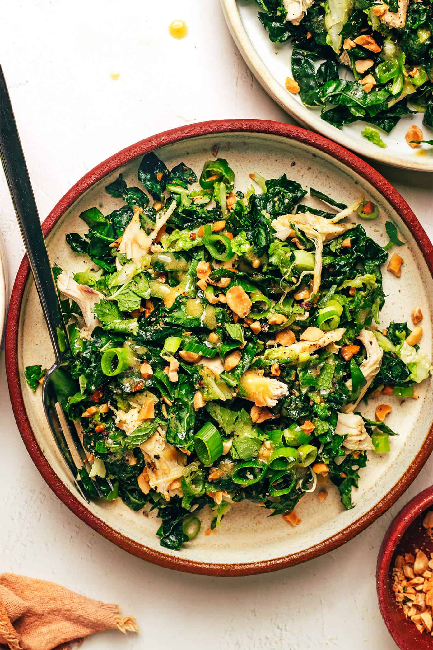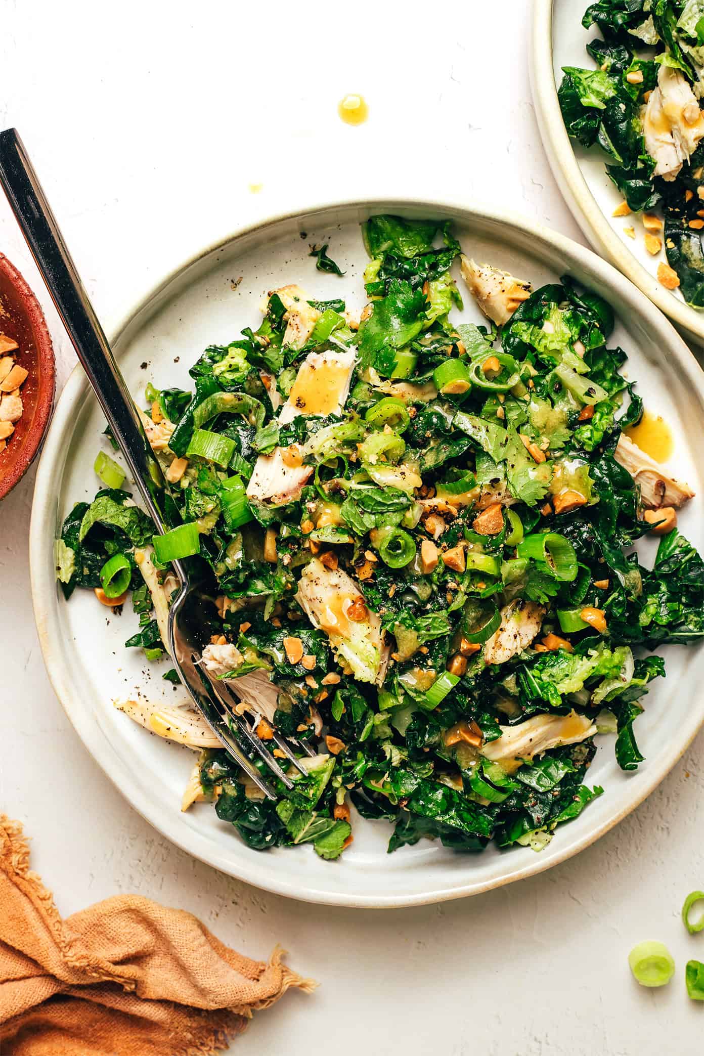 - Toss. Pour enough of the dressing over the kale mixture to moisten it, then stir to combine. Add the peanuts, mint, cilantro, green onions and chicken. Add additional dressing, stirring as you go, until the salad is moistened to your liking. Enjoy immediately or refrigerate for up to 3 hours prior to serving.