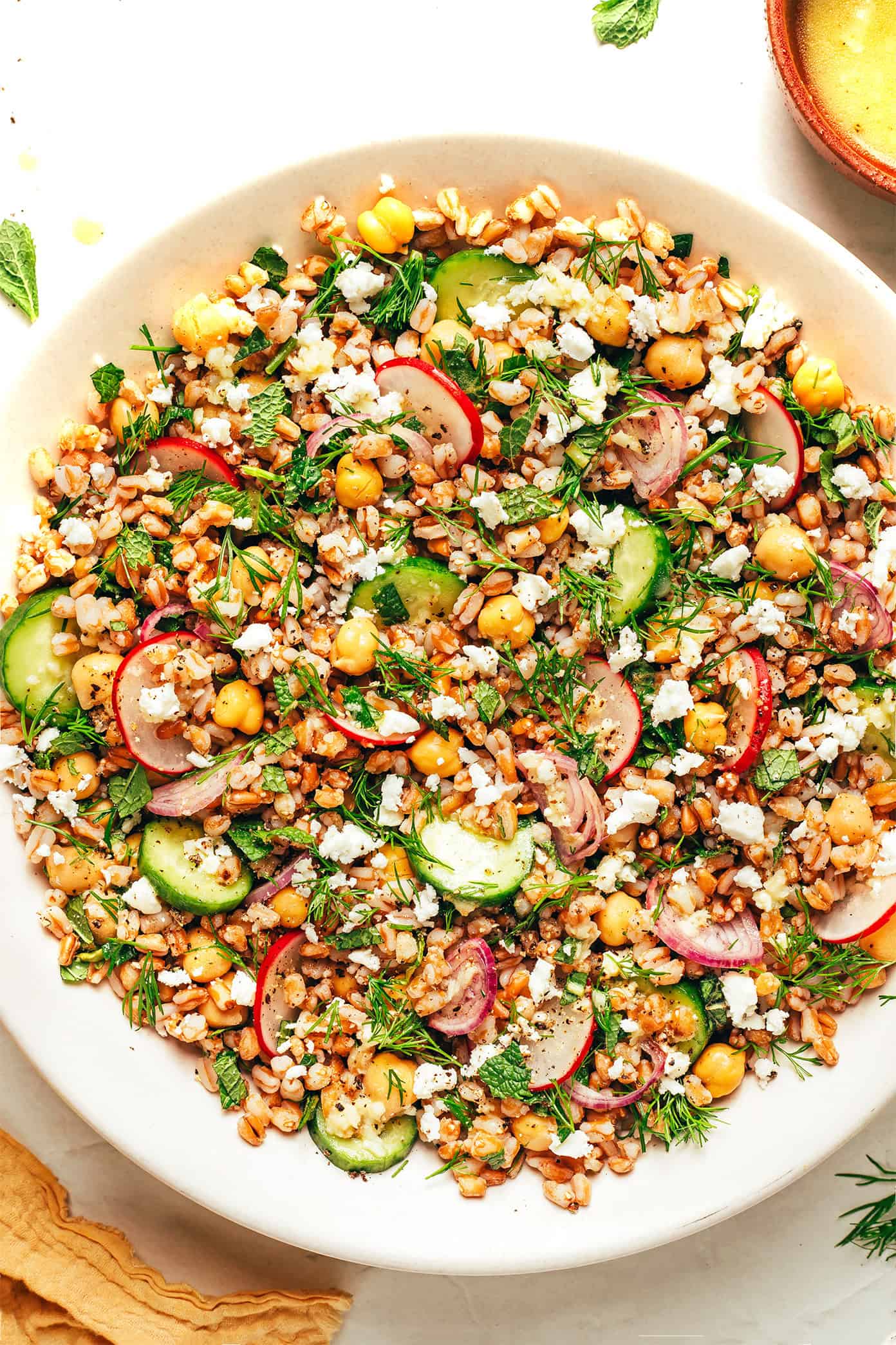 - Toss. Combine the chilled farro, chickpeas, feta, cucumbers, radishes, shallot, dill and mint in a large mixing bowl. Drizzle evenly with the dressing and gently toss to combine.