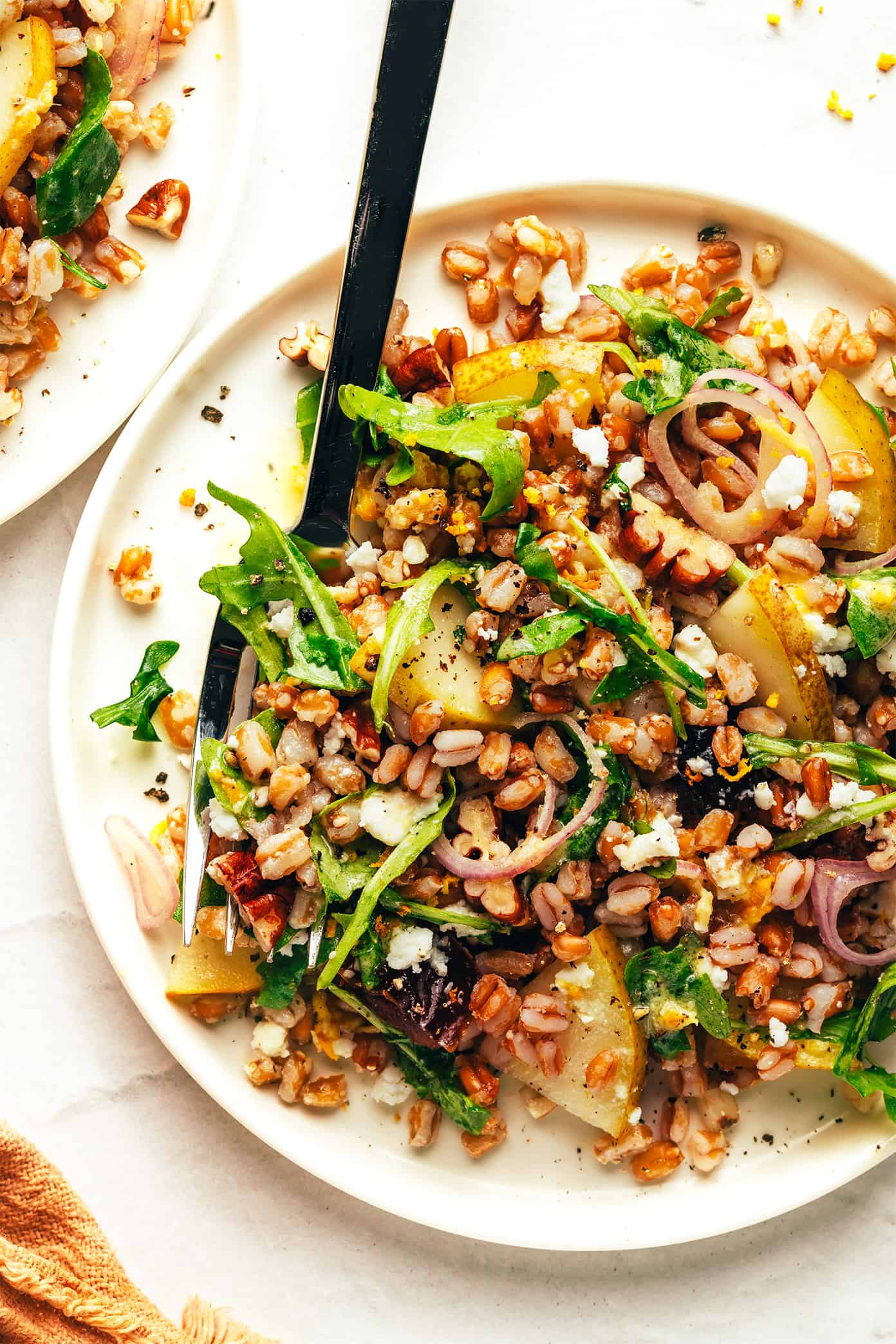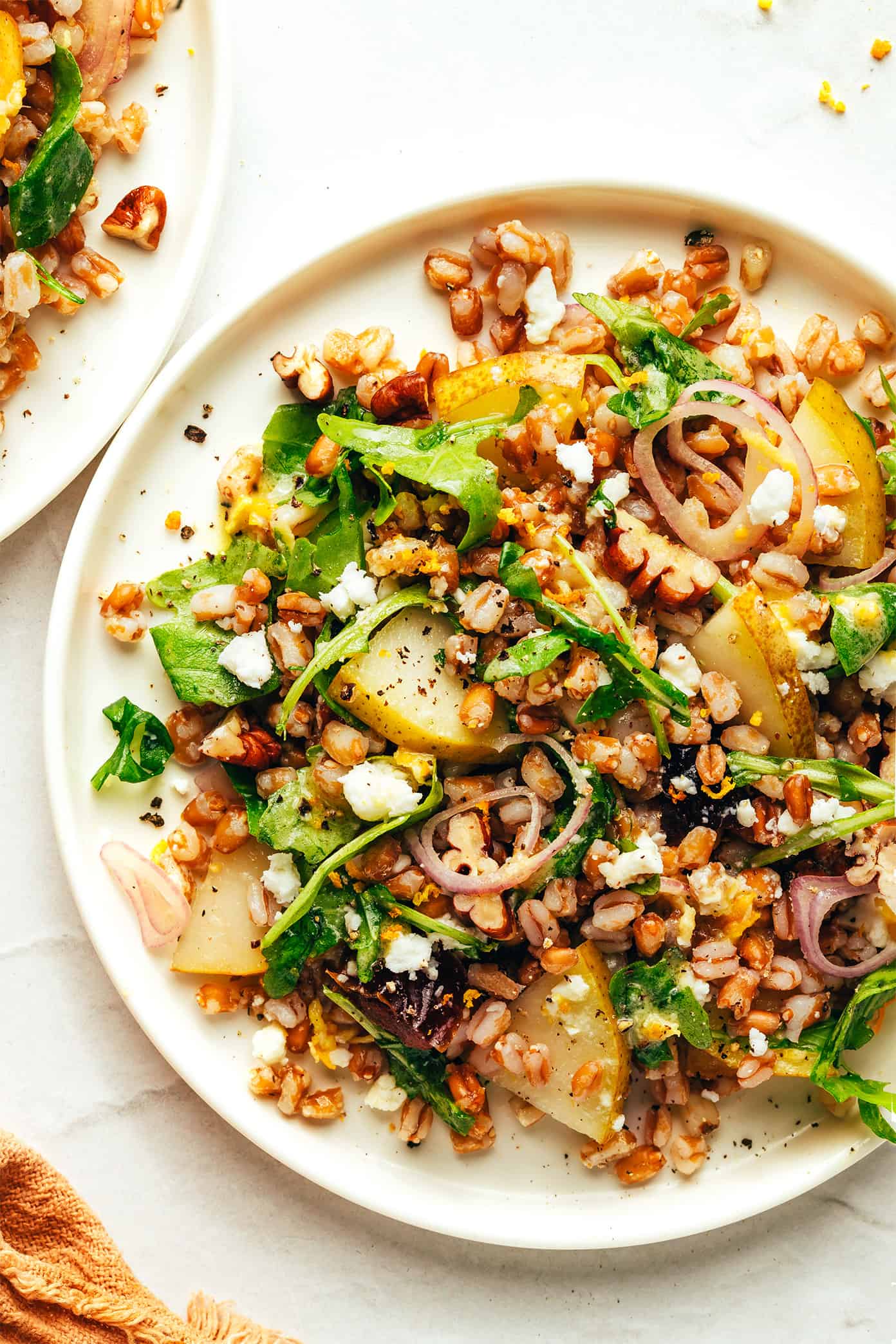 I could seriously live on this one for easy breakfasts, lunches or dinners this time of year. It’s loaded up with sweet and juicy pears (or apples, clementines, grapes…whatever fruit is most ripe that week), lots of chewy nutty farro, peppery chopped arugula, tangy crumbled goat cheese or feta, sweet chopped dates, crunchy toasted pecans and paper-thin sliced shallots. Then everything is tossed together in a vibrant orange ginger vinaigrette. So fresh, so filling, and seriously SO so delicious.