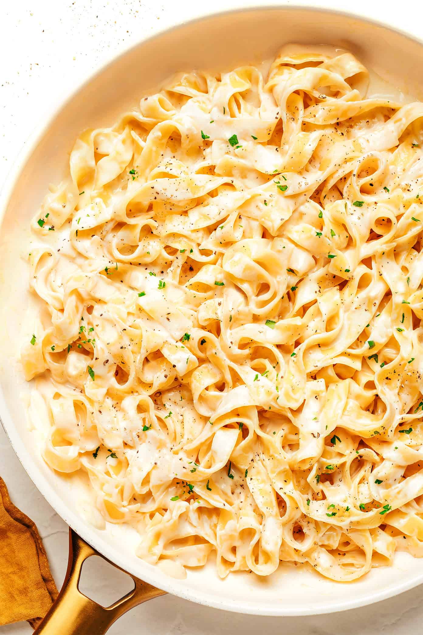 Now I will be the first to note that this Alfredo sauce recipe is “American-style,” a la the Olive Garden version that zillions of us grew up loving. By contrast to its Italian-style origins, in which the sauce was created in Rome with just butter and cheese (more similar to my cacio e pepe recipe), American-style Alfredo sauce is famously a bit more indulgent and complex. Heavy cream and/or milk are typically added to make the sauce creamier, differing levels of flour are added to create a roux and make the sauce thicker, and a number of different seasonings are often added (especially a hint of white pepper and nutmeg) to give it an extra flavor boost. So while this may come as a surprise to some, the American-style version of this sauce would definitely not be considered authentic in Italy. But hey, I think we can all agree that the creamy version of this sauce has become an iconic favorite of its own. โก