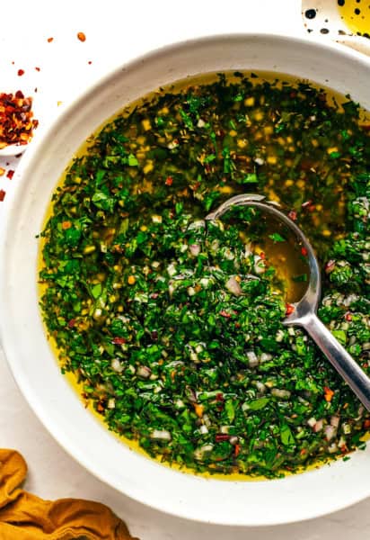 This easy chimichurri sauce recipe is quick and easy to make and adds fresh, zesty flavor to grilled meats, vegetables, and more.