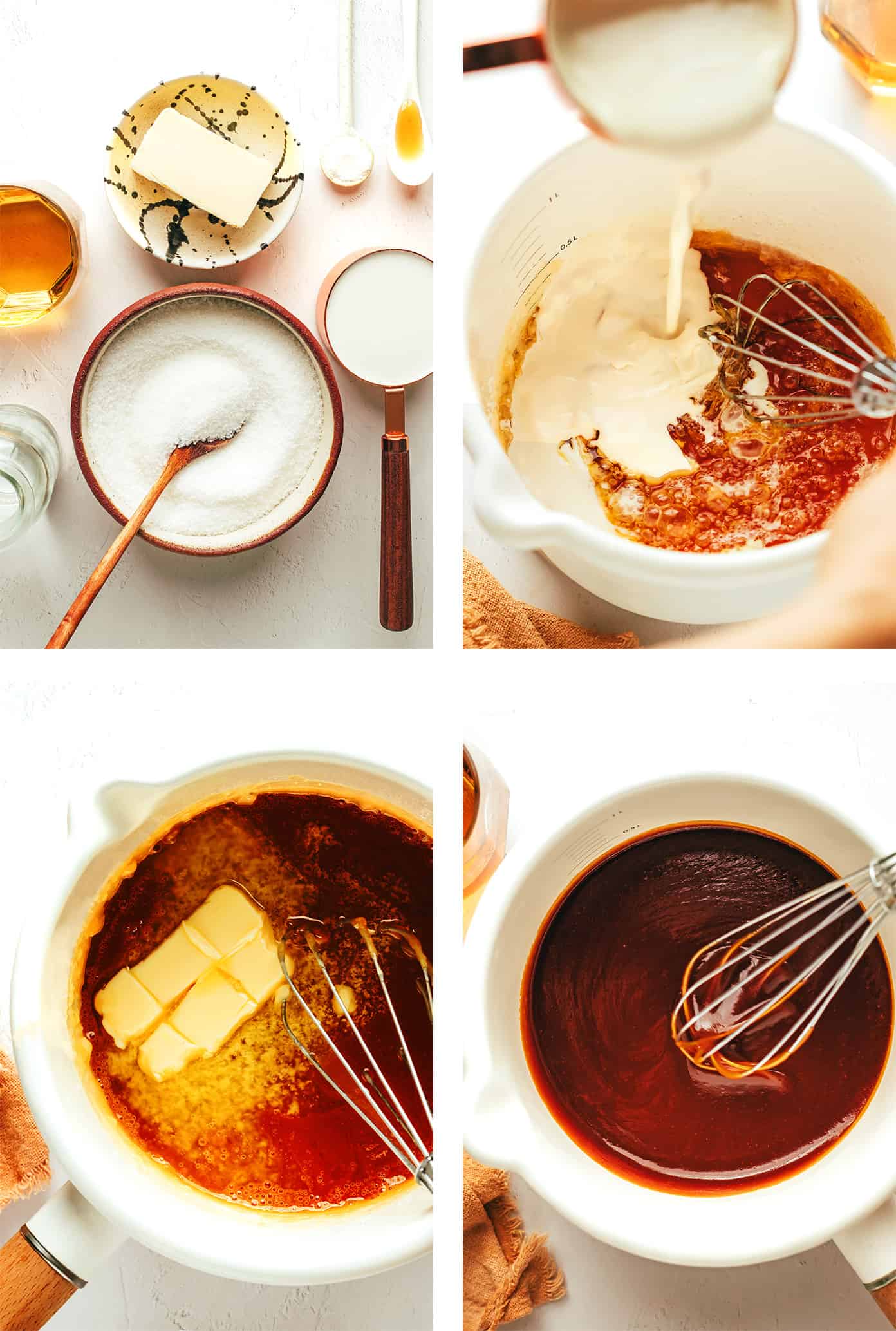 - Add the remaining ingredients. Slowly and carefully pour the heavy cream into the sugar mixture, whisking as you pour to quickly incorporate the cream. (The mixture will bubble furiously when the cream hits the hot sugar, so be very careful!)ย Then addย in the butter and whisk until combined. And finally, add in the vanilla, bourbon and sea sea salt, and whisk until combined.