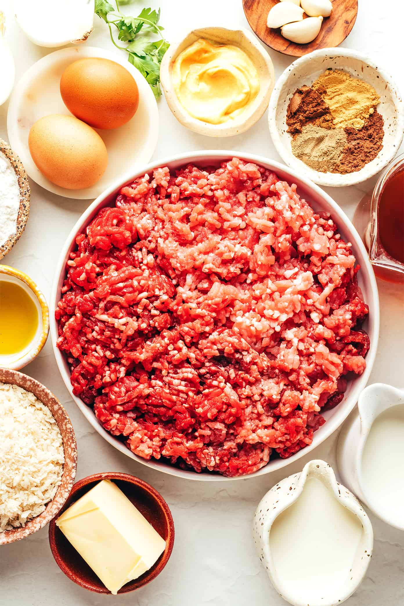 - Ground beef and pork: I like to use a 50/50 mix of the two to make meatballs, but you can also make all-beef or all-pork meatballs if you prefer. (Or you can sub in ground turkey or chicken.)
