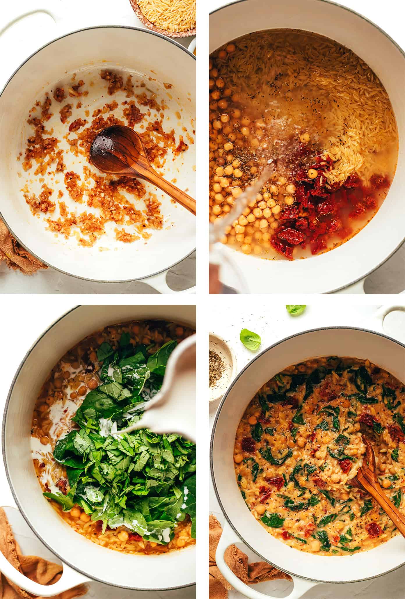 - Simmer. Add the chickpeas, vegetable broth, orzo, sun-dried tomatoes, Italian seasoning and stir to combine. Continue cooking until the mixture reaches a simmer, stirring frequently. Reduce heat to medium-low, or whatever temperature is needed to maintain a low simmer. Then continue simmering, stirring frequently, until the orzo is just shy of al dente.ย