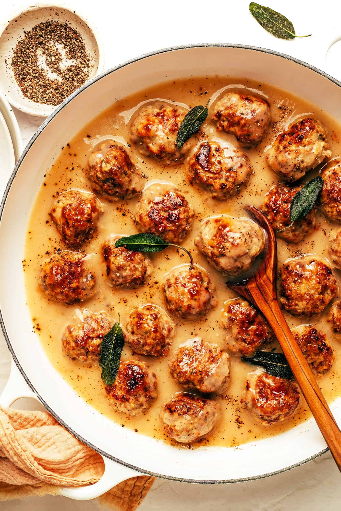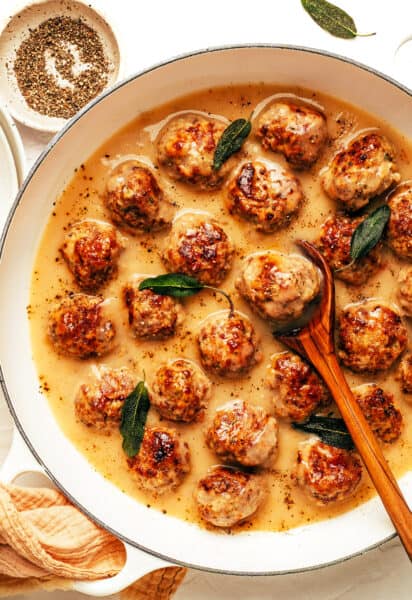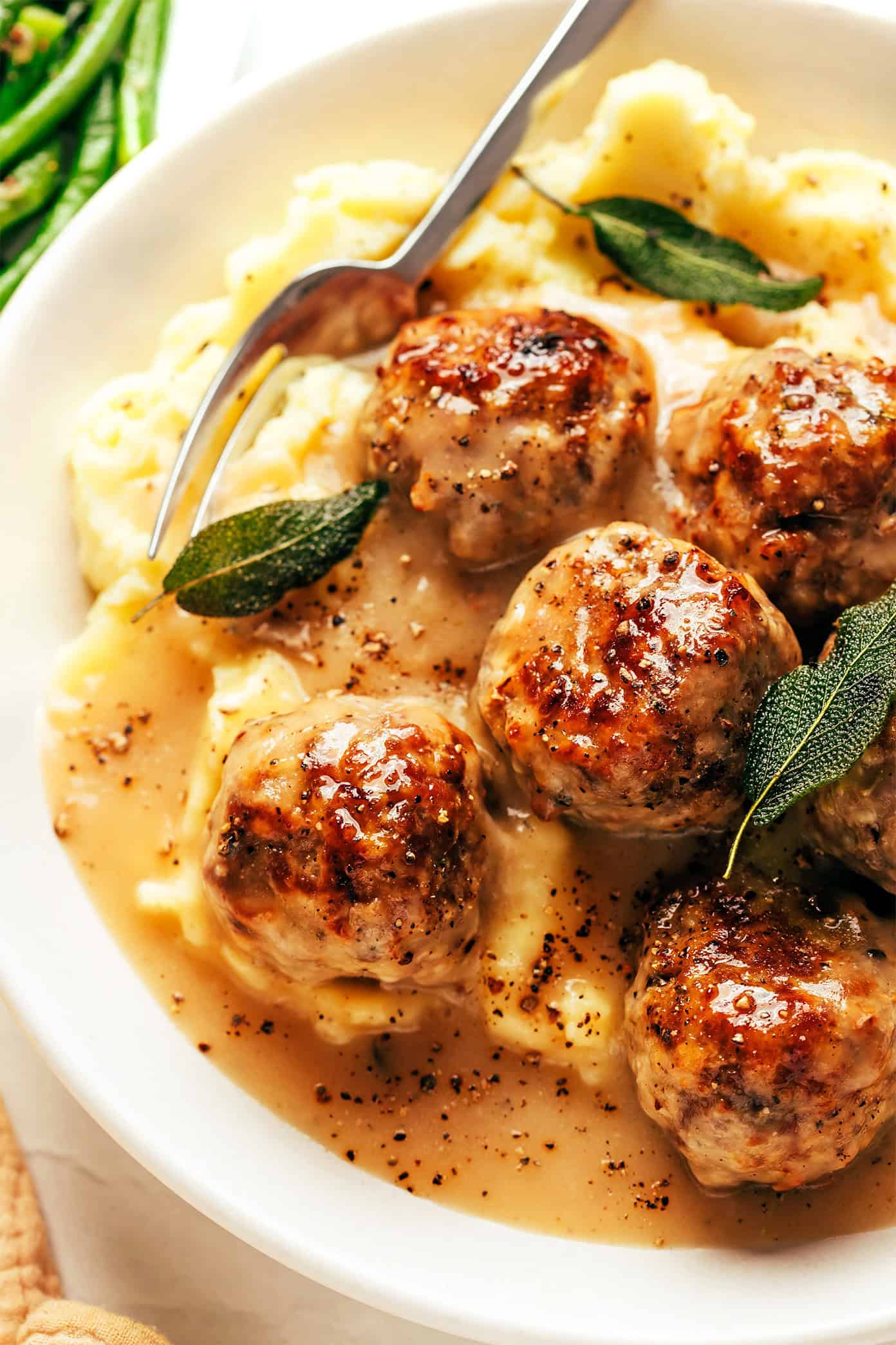 8. Garnish and serve. If desired, fry a few sage leaves in a bit of butter or oil until crisp and use as garnish. Serve the meatballs hot over mashed potatoes, buttered noodles, or rice โ€” spooning plenty of that rich gravy on top.