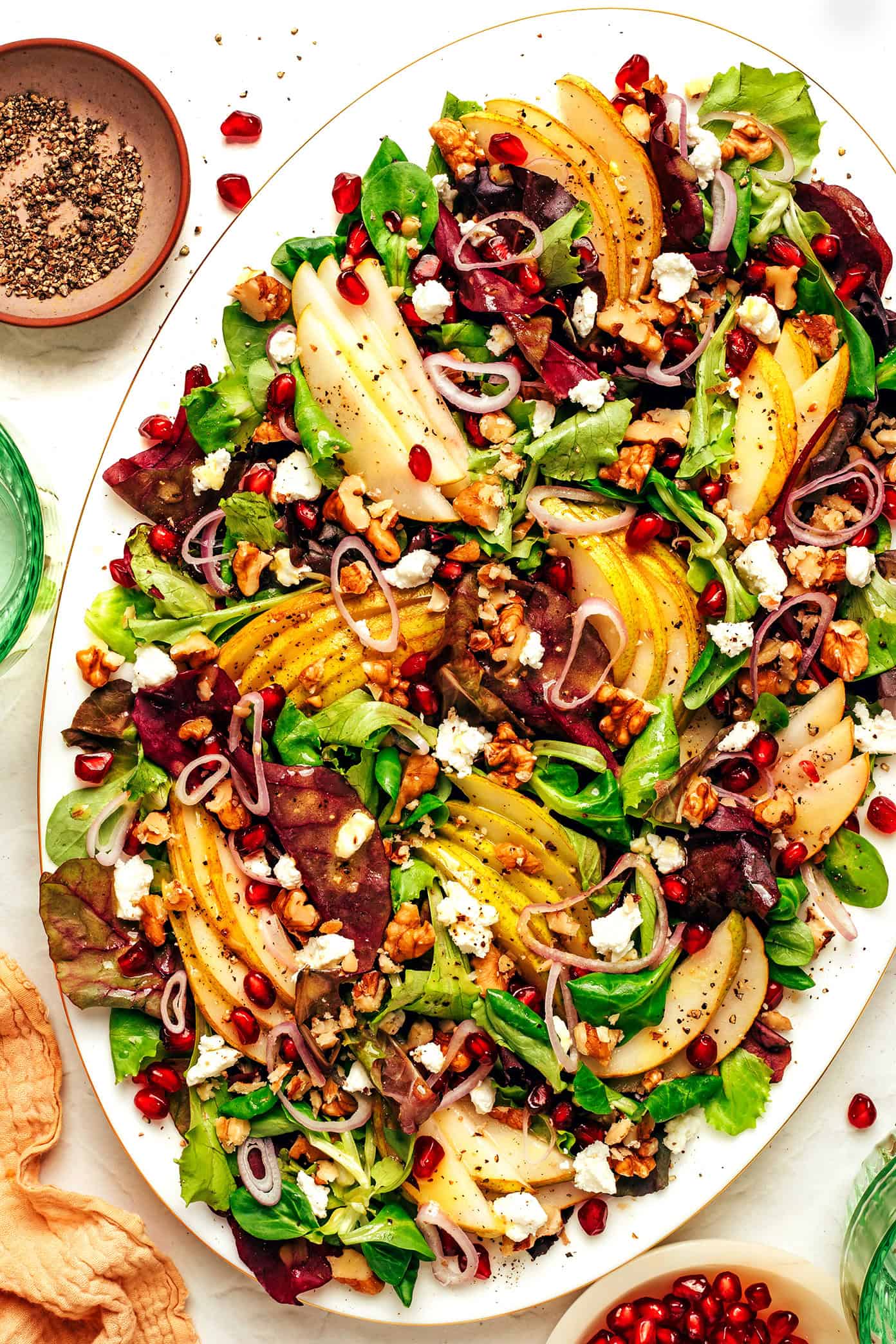 This pear salad recipe features juicy pears, creamy goat cheese, toasted walnuts, pomegranate arils, and a light white balsamic dressing โ a fresh and elegant salad thatโs perfect for any occasion!