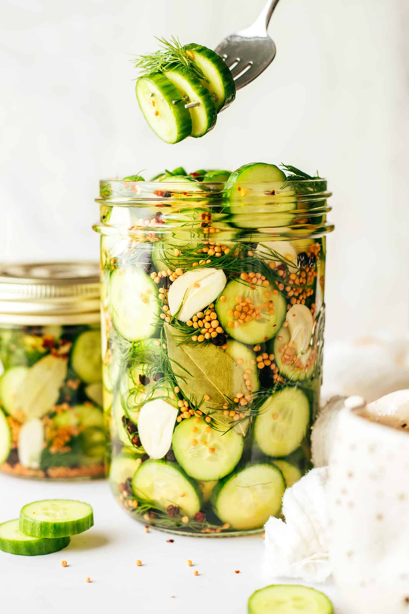 1. Layer the pickles. It’s much easier to add the large ingredients (cucumbers, dill, garlic, bay leaf) to the jar before adding the brine, in order to help everything fit.