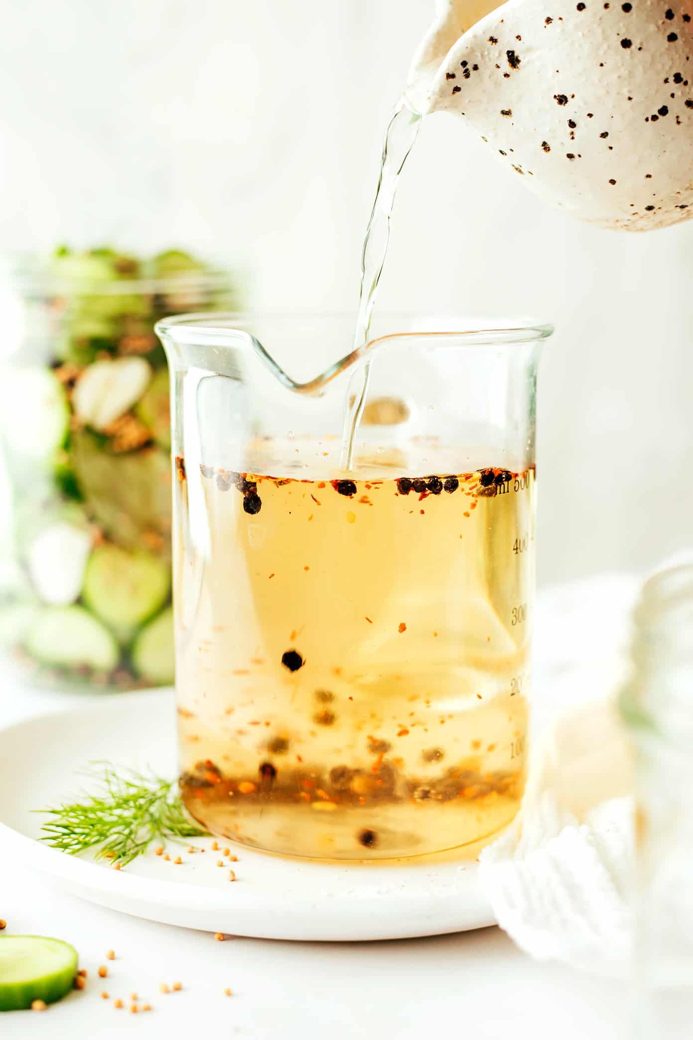 2. Mix the brine.ย No need to heat the brine for this recipe unless you are adding sweetener (see note below). I typically measure and stir everything together in a measuring jar, then add it to the pickle jar. But if you could alternately just mix the brine directly in the pickle jar itself.