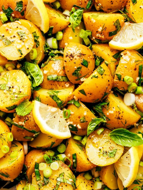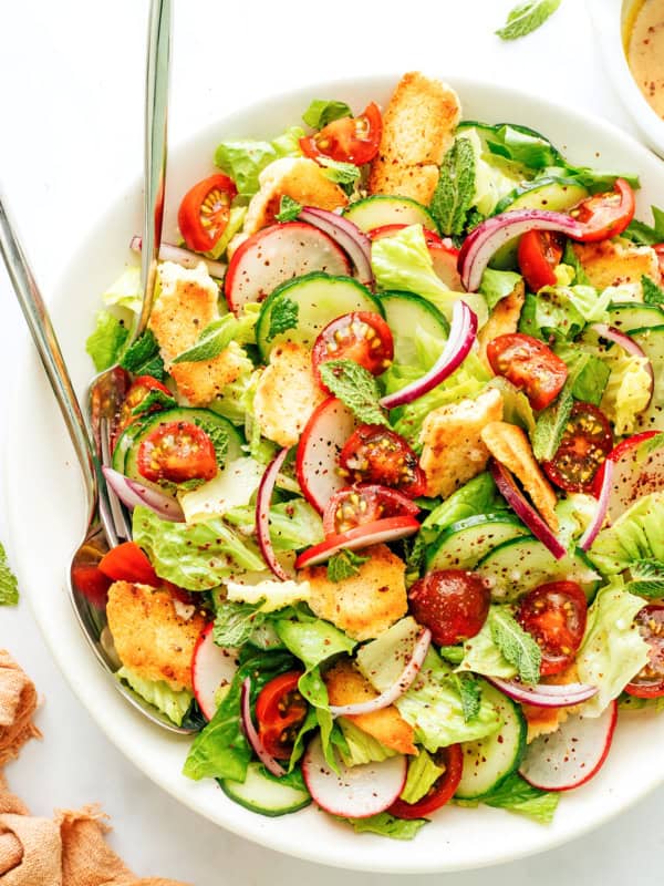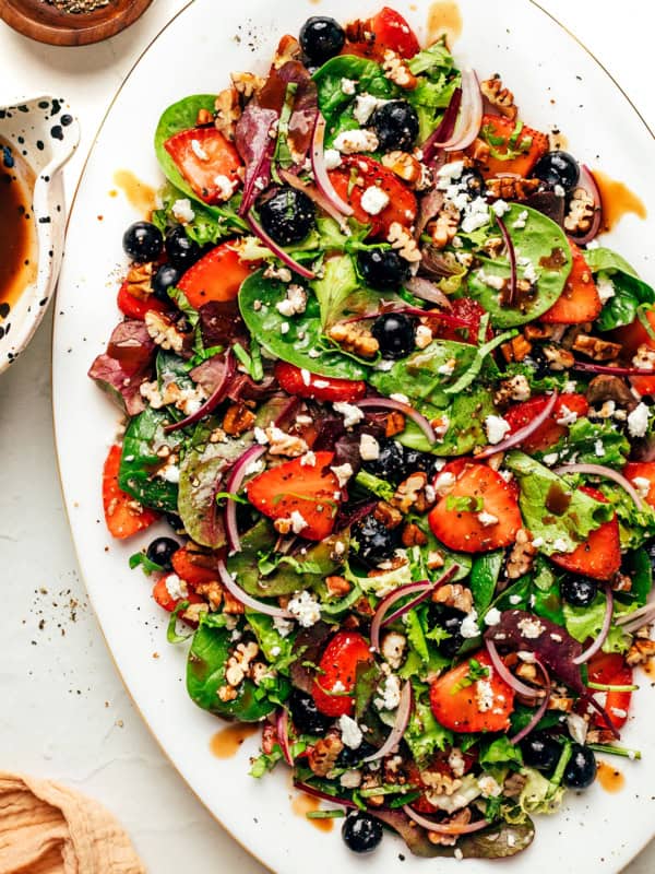 Our vibrant collection of salad recipes is full of fresh, feel-good favorites for any occasion. From green side salads to hearty entrรฉes, pasta salads to potato salads, panzanella to fruit salads and more, there’s something here for everyone! If you’re trying to add more greens to your week, start with the simple everyday side salad that we make multiple times a week — the dressing goes with just about everything!