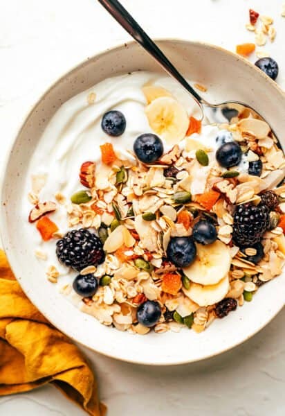 I also love that there are so many fun ways to eat muesli. You can serve it cereal-style (cold with milk), hot oatmeal-style (warmed with milk or water), overnight oats-style (soaked in milk or water or fruit juice overnight) or — my personal favorite — parfait-style (layered with Greek yogurt and fresh berries). Toppings are of course always welcome, such as fresh or frozen fruit, a spoonful of nut butter, or a handful of chocolate chips. And if you find that you’d like your bowl to be a bit sweeter, just add a drizzle of honey or maple syrup on top. Delish!