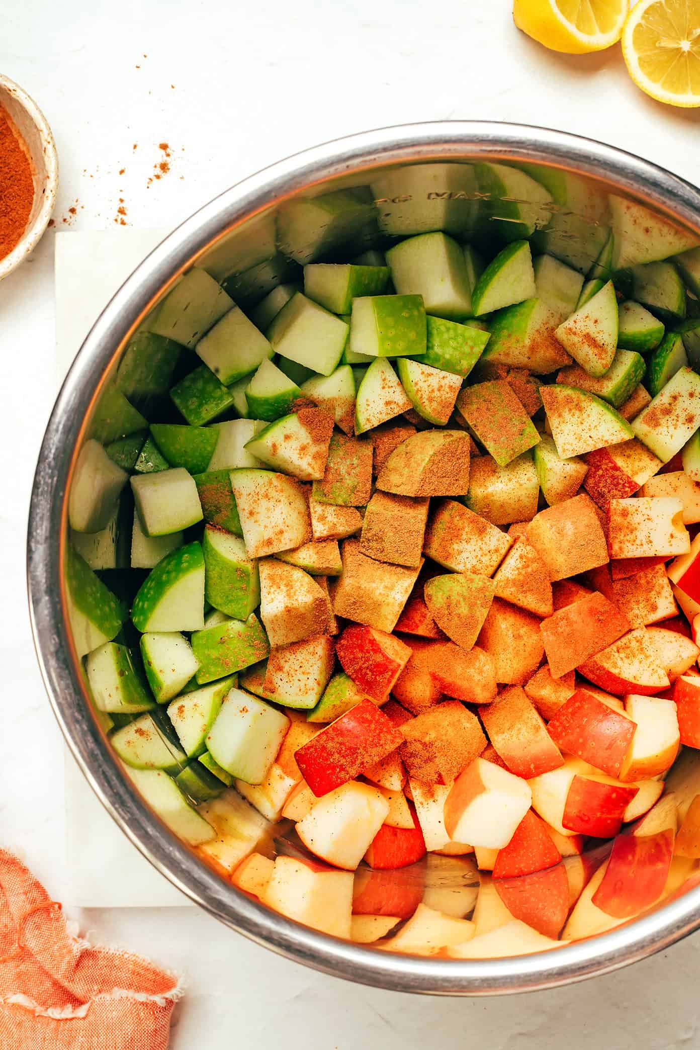 - Use a 1-inch dice if leaving the apples unpeeled. Again, I prefer to save time (and nutrients!) and leave my apples unpeeled when making homemade applesauce. But in order to avoid having large peels in the mix, I recommend dicing the apples into 1-inch chunks before adding them to the recipe.