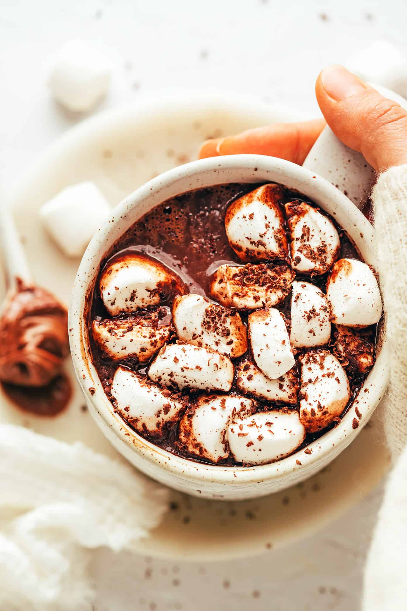 - Add graham crackers: Top the hot chocolate with a sprinkling of crushed graham crackers (and, optional, roast the marshmallows until charred) to give this more of a s’mores hot chocolate vibe.