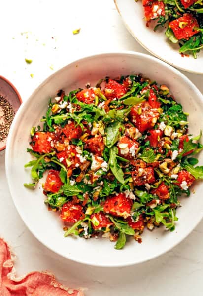 It was everything a summer salad should be — juicy watermelon, peppery arugula, salty feta, crunchy nuts, fresh mint, and crispy shallots, all tossed together in a light and tangy vinaigrette. We couldn’t stop talking about it the rest of the week! So as soon as we arrived home, I started testing my own version, and it has quickly earned a permanent spot in our rotation during watermelon season.