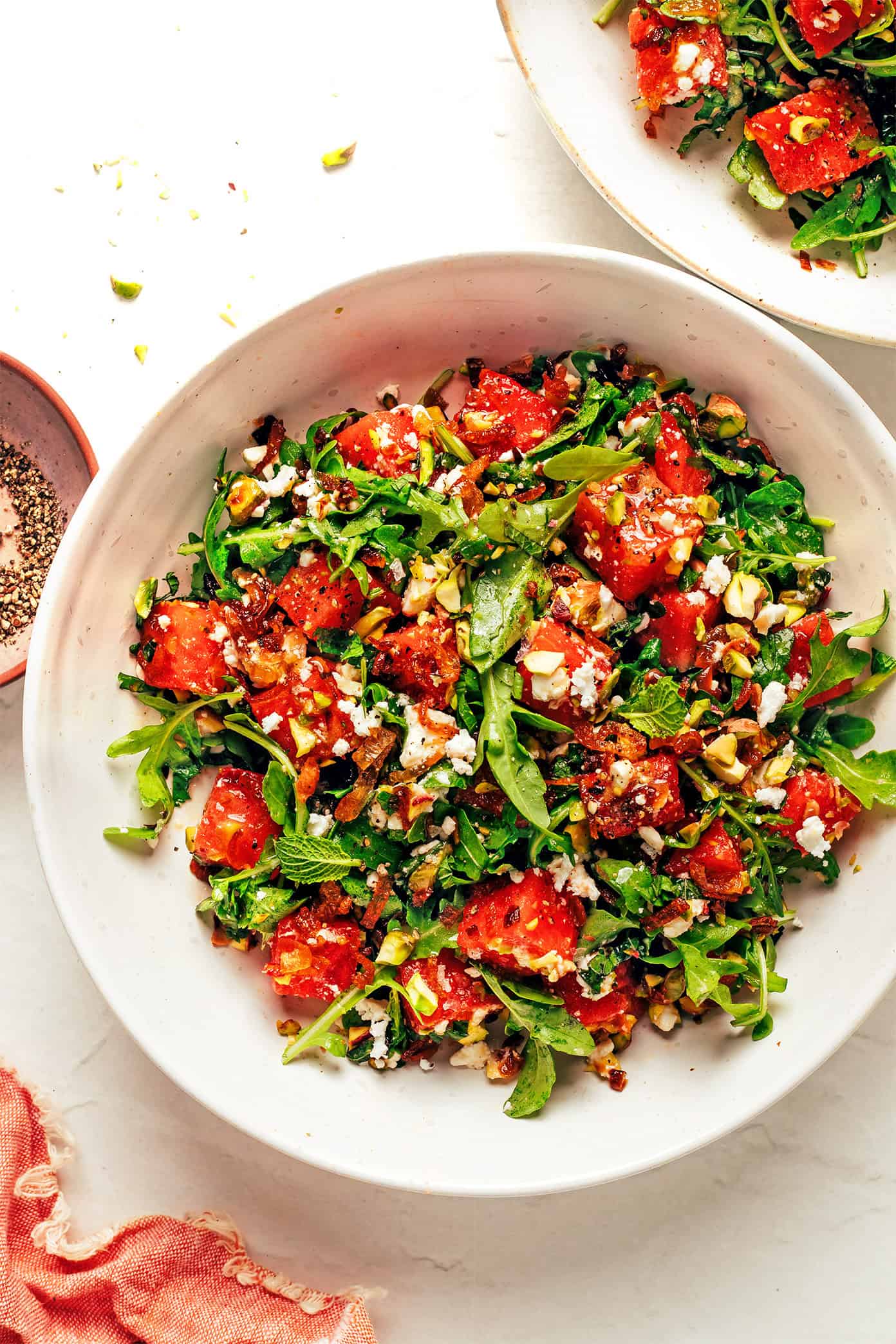 2. Assemble the salad. In a large mixing bowl, combine the watermelon, arugula, feta, half of the pistachios, half of the shallots and mint. Drizzle evenly with the vinaigrette. Toss very gently until combined.