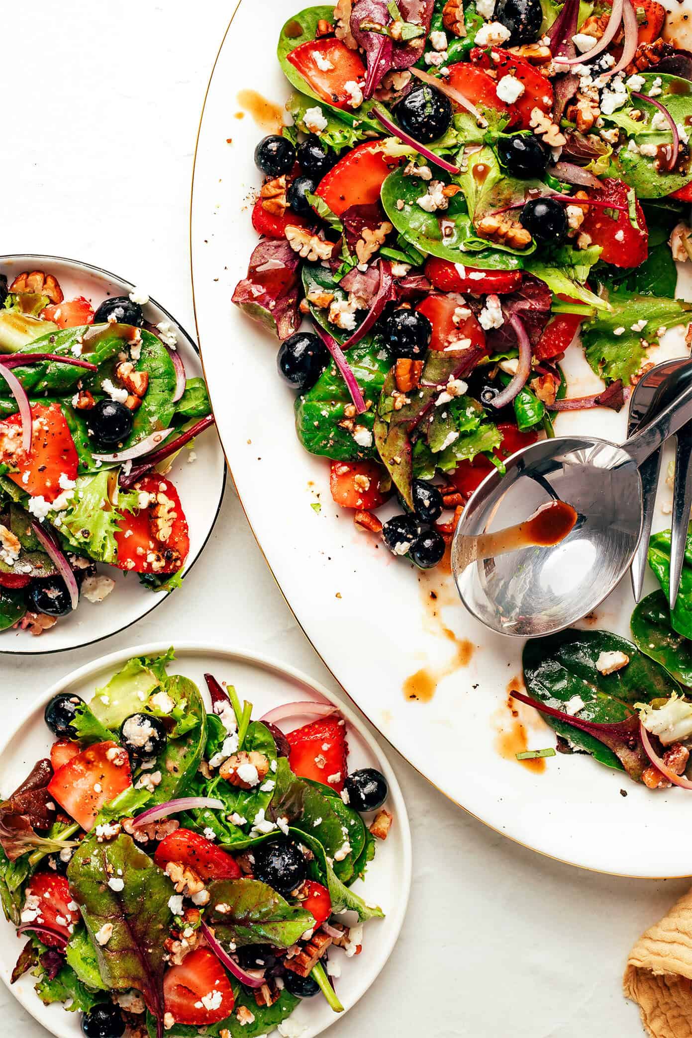 - Assemble the salad. Combine the greens, strawberries, blueberries, pecans, feta and onion in a large mixing bowl. Drizzle evenly with the vinaigrette and toss gently to combine.