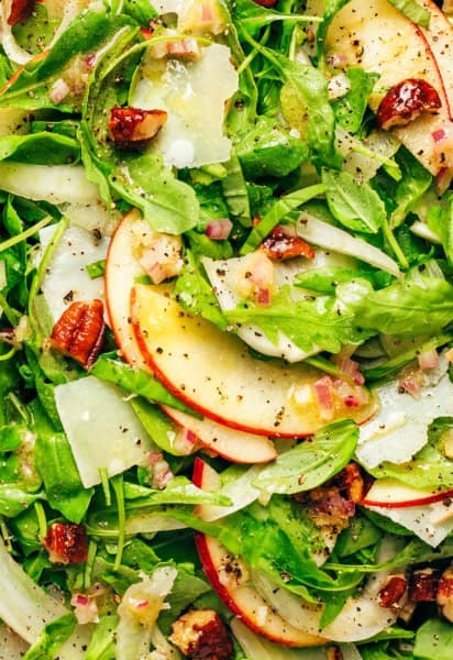 This refreshing shaved apple, fennel and arugula salad is tossed with candied pecans, Parmesan, basil and a lemon shallot vinaigrette.
