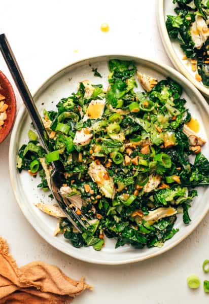 - Toss. Pour enough of the dressing over the kale mixture to moisten it, then stir to combine. Add the peanuts, mint, cilantro, green onions and chicken. Add additional dressing, stirring as you go, until the salad is moistened to your liking. Enjoy immediately or refrigerate for up to 3 hours prior to serving.