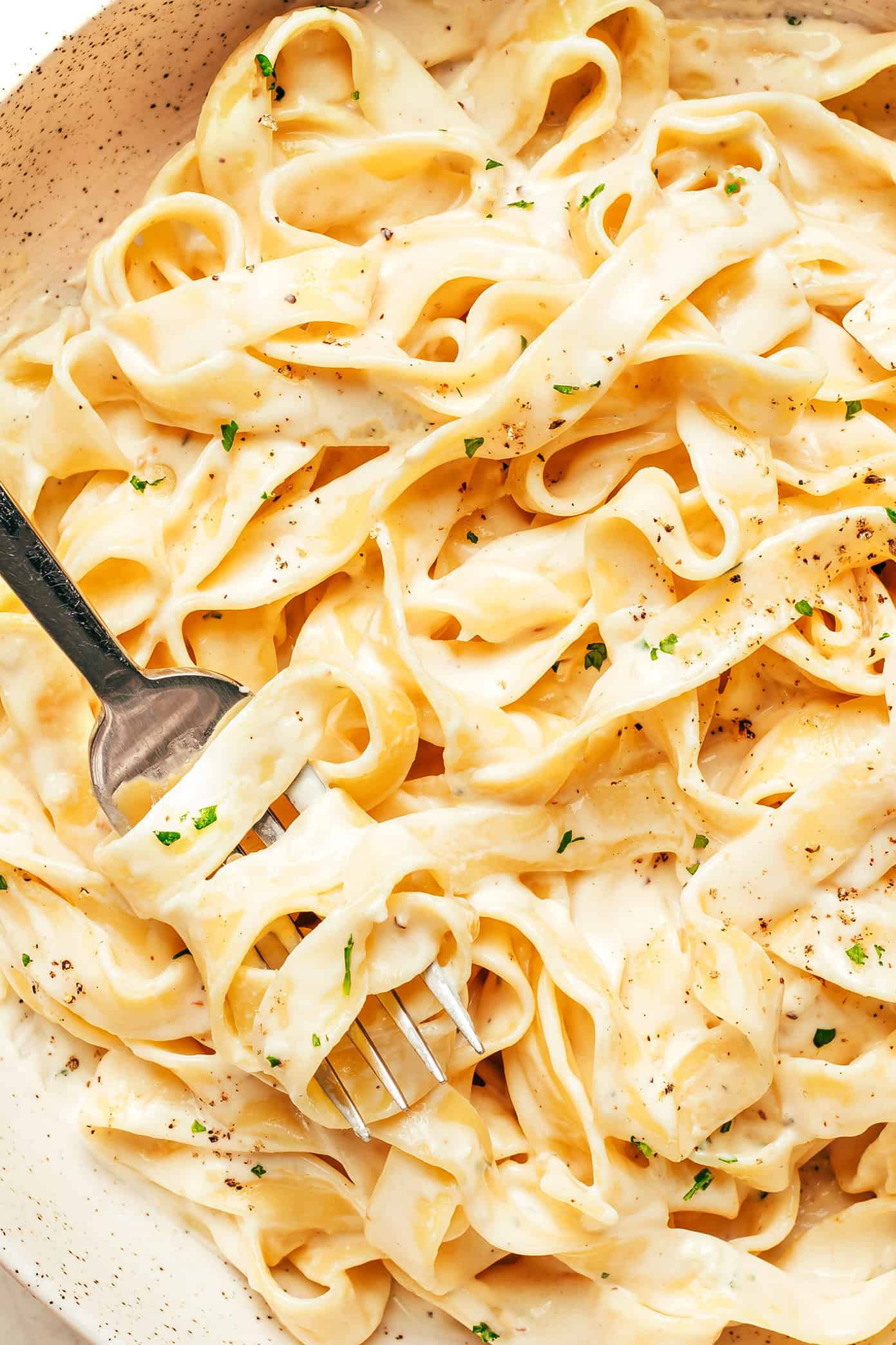 Now I will be the first to note that this Alfredo sauce recipe is “American-style,” a la the Olive Garden version that zillions of us grew up loving. By contrast to its Italian-style origins, in which the sauce was created in Rome with just butter and cheese (more similar to my cacio e pepe recipe), American-style Alfredo sauce is famously a bit more indulgent and complex. Heavy cream and/or milk are typically added to make the sauce creamier, differing levels of flour are added to create a roux and make the sauce thicker, and a number of different seasonings are often added (especially a hint of white pepper and nutmeg) to give it an extra flavor boost. So while this may come as a surprise to some, the American-style version of this sauce would definitely not be considered authentic in Italy. But hey, I think we can all agree that the creamy version of this sauce has become an iconic favorite of its own. โก
