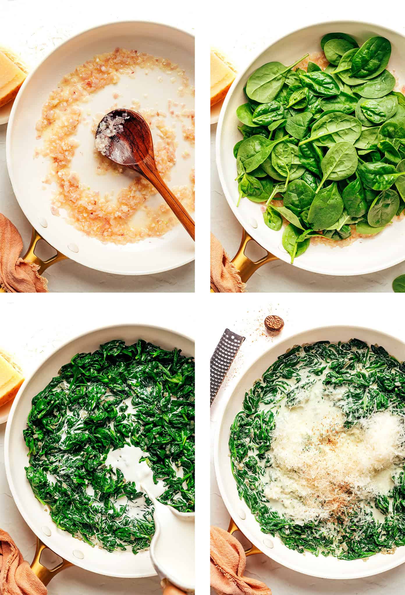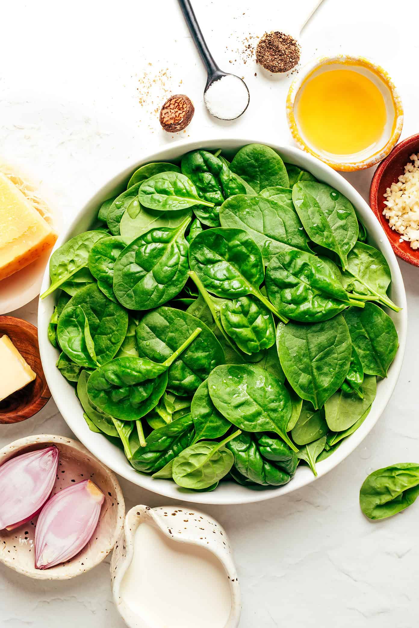Over the years Iโve tested countless versions of this classic side dish โ from frozen spinach shortcuts to heavier cheese variations to various seasoning blends โ and this simple recipe is the one I’ve landed on as a forever favorite. It starts with a heaping pile of fresh baby spinach that wilts down into a silky, delicate base, then gets gently mixed with sautรฉed shallot, garlic, Parmesan, and a hint of nutmeg. The result tastes vibrant and fresh, creamy without feeling too heavy. And best of all, it’s quick and easy to make.