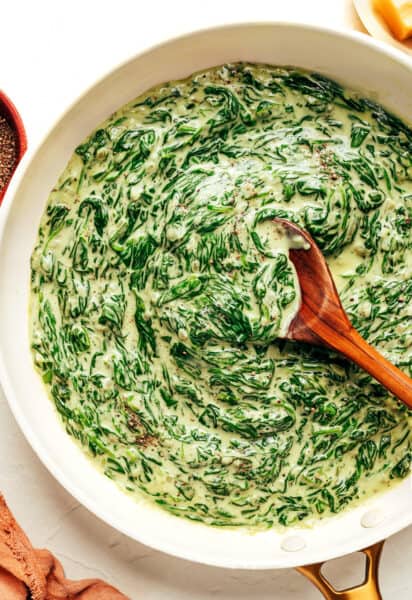 This classic creamed spinach recipe is easy to make, wonderfully creamy, and perfectly balanced with fresh spinach, garlic, Parmesan, and a hint of nutmeg.