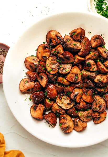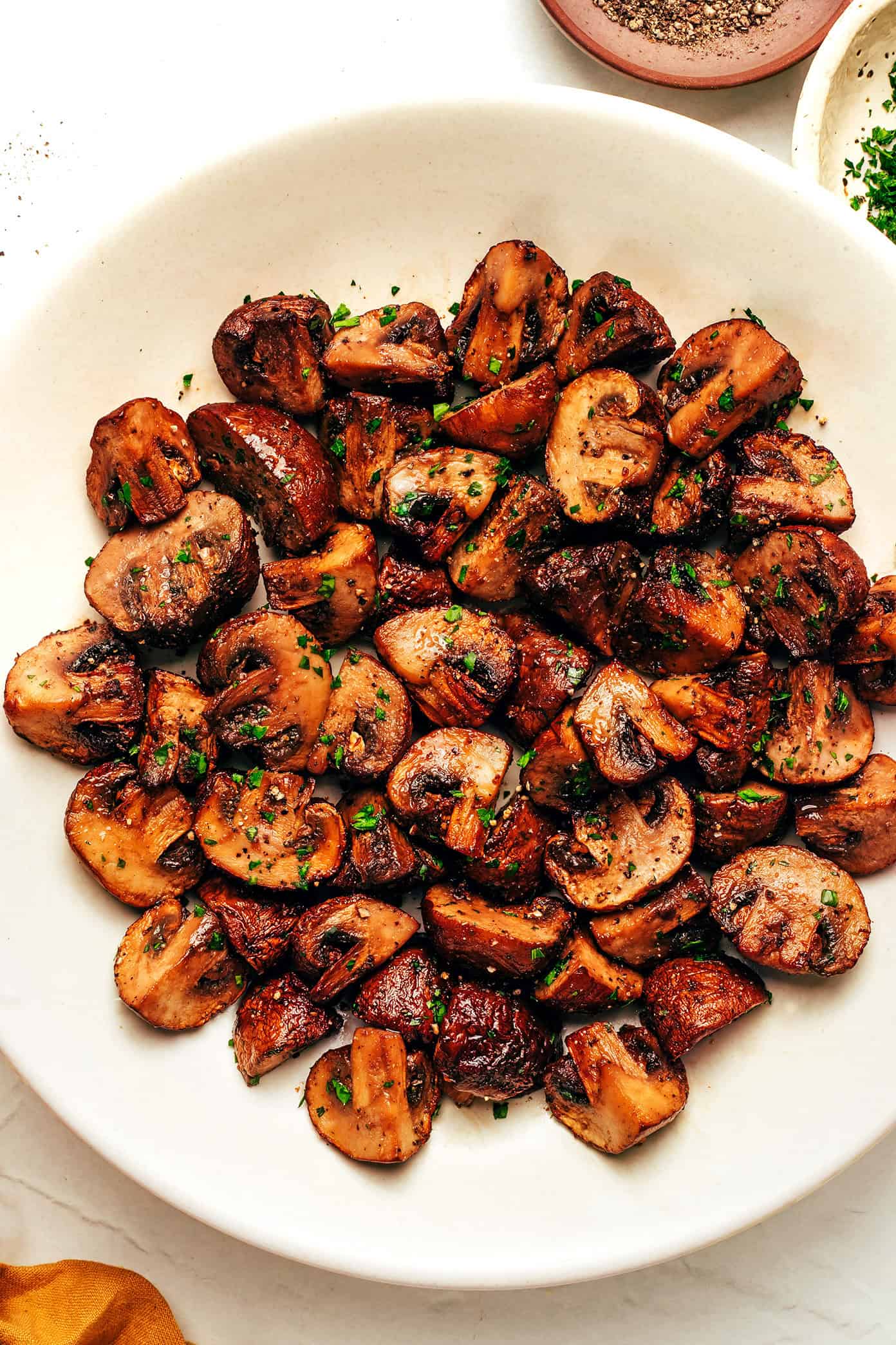 Serve them as a quick side with steak or salmon, toss them into pasta or risotto, or (my fave) grab a fork and eat them right out of the air fryer basket as a savory snack. However you serve them, these air fryer mushrooms are guaranteed to disappear fast!