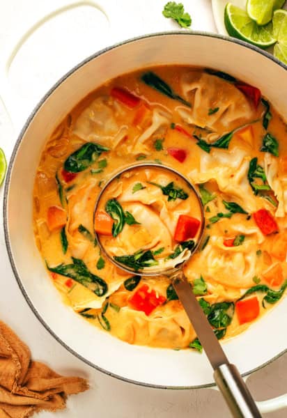 This Thai red curry potsticker soup comes together easily in 30 minutes and is bursting with rich coconut curry flavors.