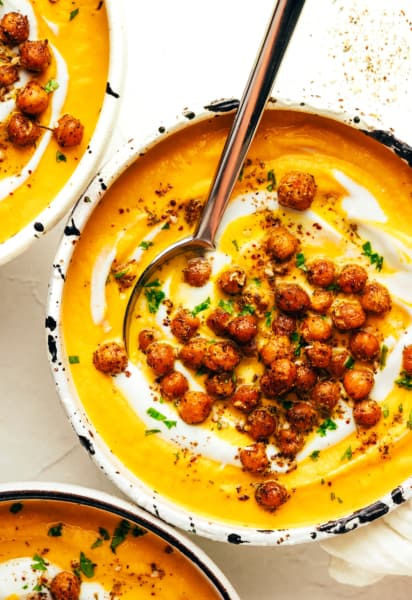 We love this soup in our house because it’s easy to make with a short list of healthy ingredients, including a full pan of carrots that are roasted until perfectly caramelized in the oven and purรฉed with creamy tahini, veggie broth, lemon juice, and a few simple seasonings. But the best part of this recipe is arguably the za’atar chickpeas that roast alongside the carrots to crispy, earthy, savory perfection. They’re meant to serve as a crunchy topping for the soup, but at least half of the pan typically disappears in our house before they make it to the soup — they’re too irresistible!