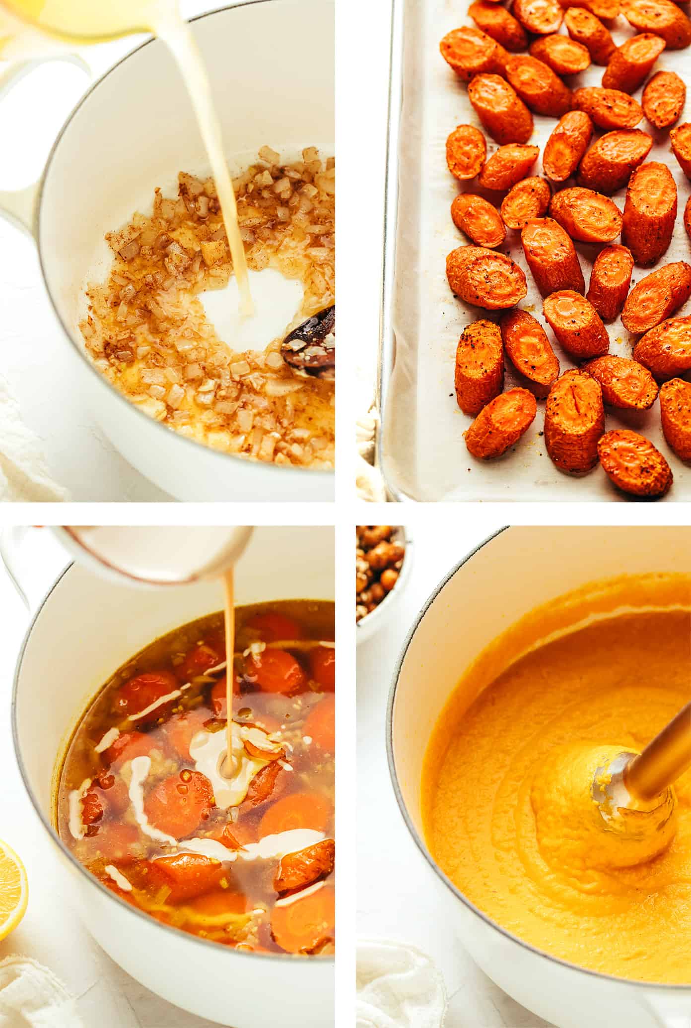 Full instructions for how to make roasted carrot soup are included in the recipe below, but here are a few extra tips to keep in mind: