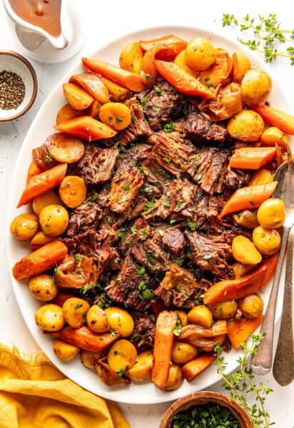 This classic oven-braised pot roast recipe features tender beef, carrots, and potatoes simmered in a rich red wine sauce — a hearty, comforting dinner perfect for Sunday gatherings or cozy weeknights. Instant Pot and Crock-Pot instructions included in the notes below.